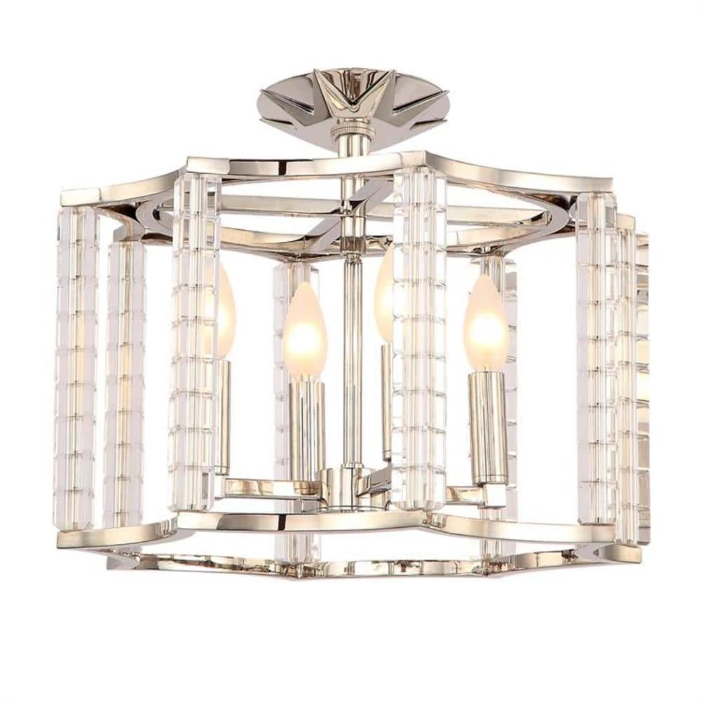 A luminescent crystal cubes create a high glam statement in the Carson Collection highlighting a sleek nickel based candle sleeves in the center. Magnificently modern, the fixture, adds the perfect amount of sophisticated statement to any space and perfectly catches the light. Crystorama is known for its standout lighting, which is exceptional in quality and design.