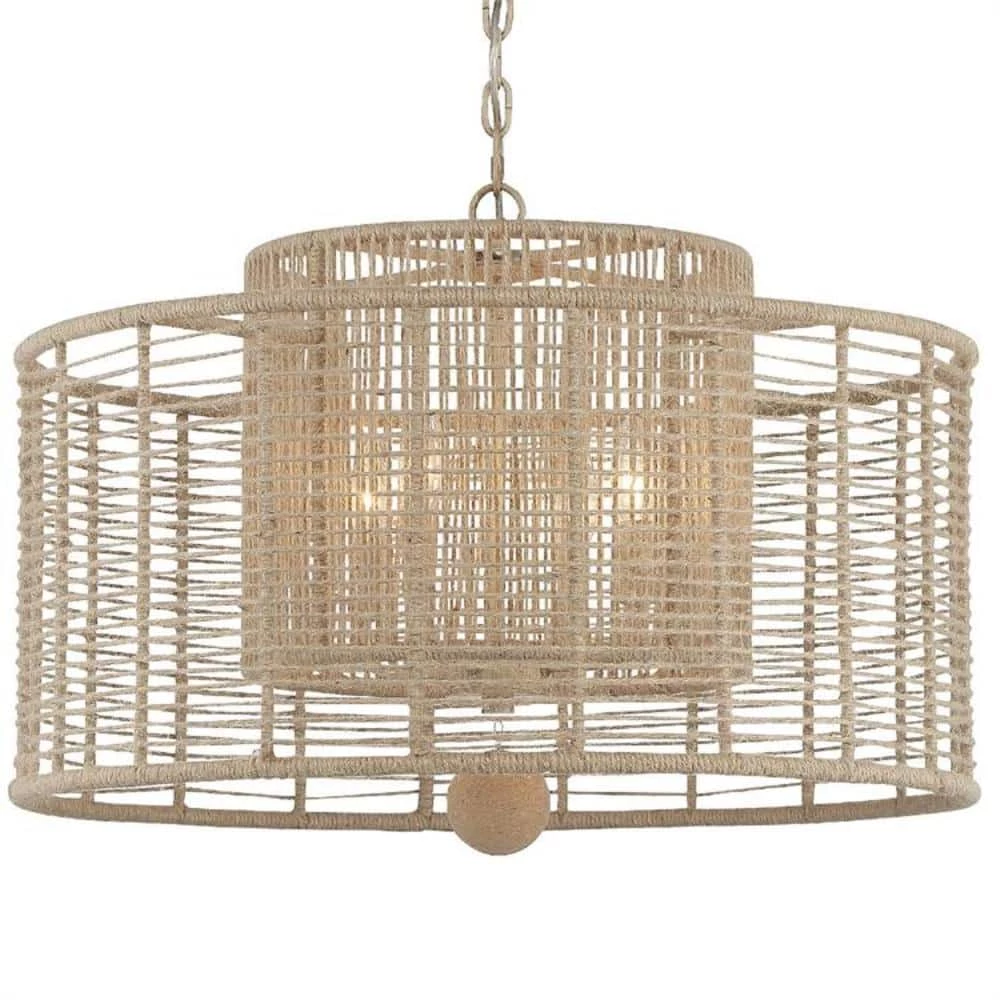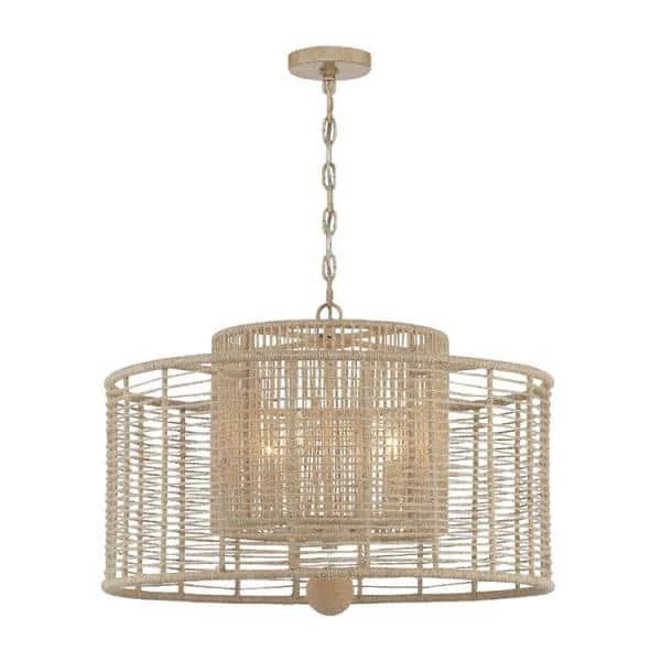 The natural jute thread of the Jayna chandelier brings farmhouse style to a home. The two-layered shade of the open-weave drum adds visual interest to a space while still combining just the right amount of sophistication. Whether the look is rustic, industrial, or boho, this light is as versatile as it is stylish. Crystorama is known for its standout lighting, which is exceptional in quality and design.