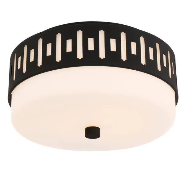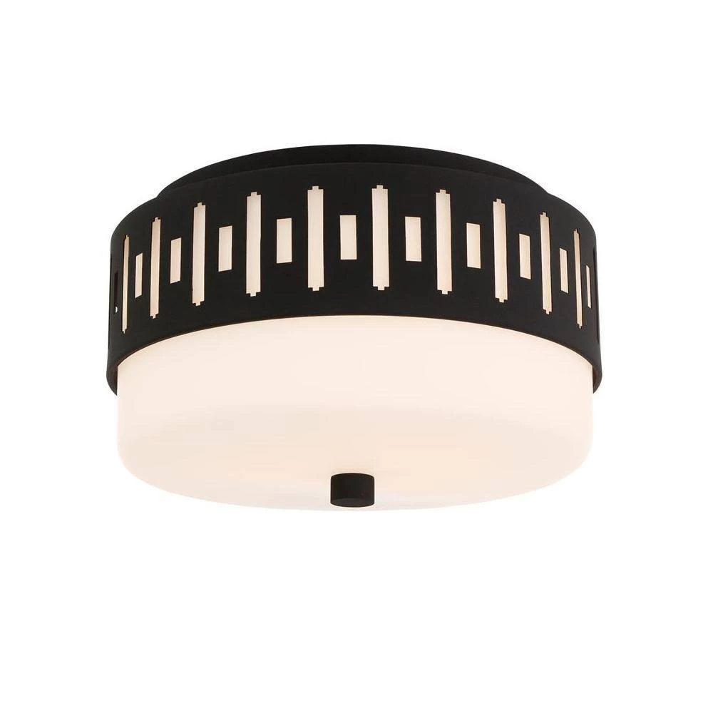 The white glass and geometric metal pattern of the Keaton ceiling mount is a functional and stylish addition to spaces that have low ceilings. The solid glass evenly diffuses the spread of light throughout the room, casting a soft glow. Crystorama is known for its standout lighting, which is exceptional in quality and design.