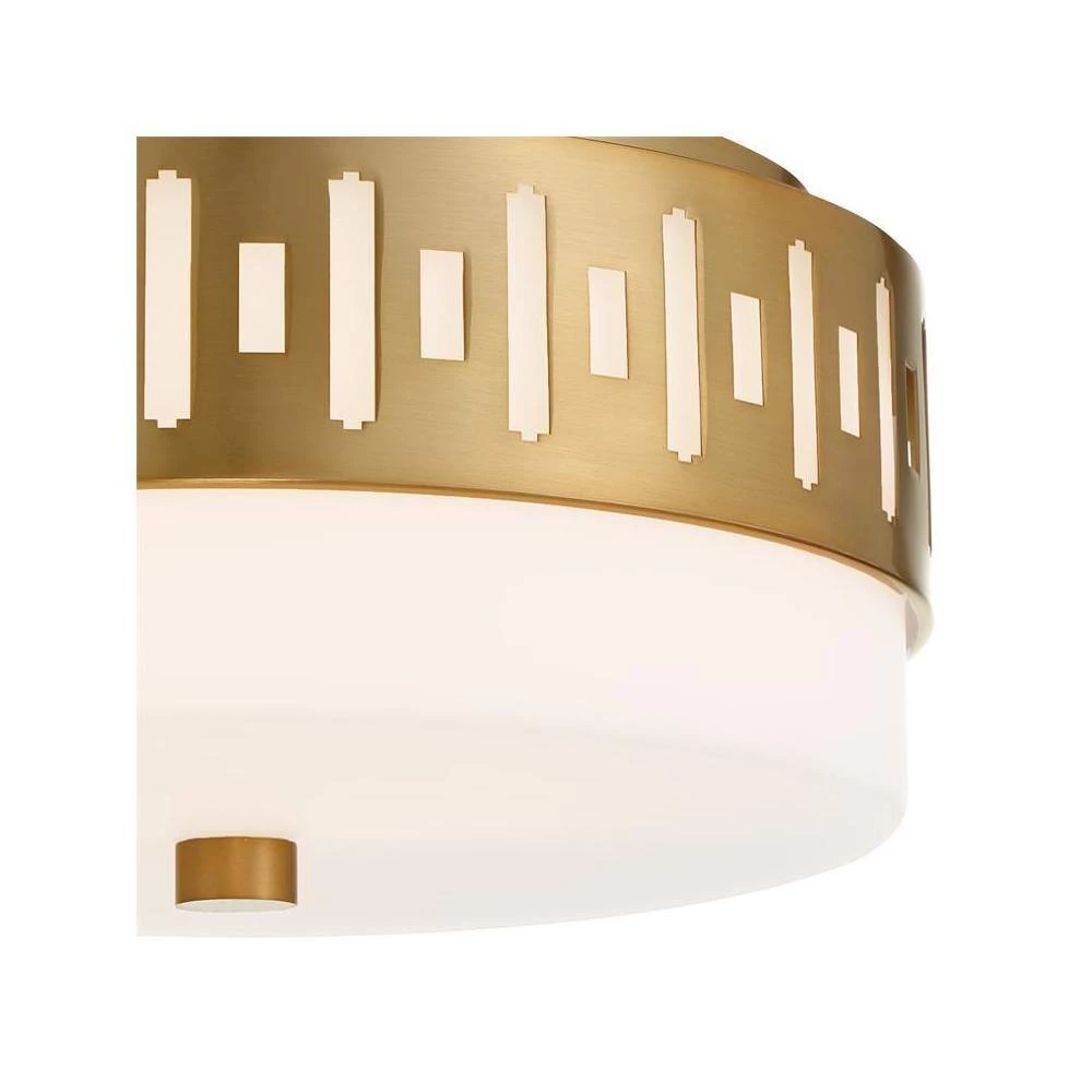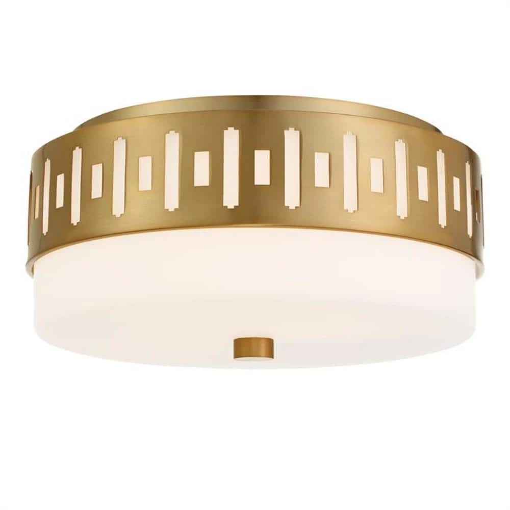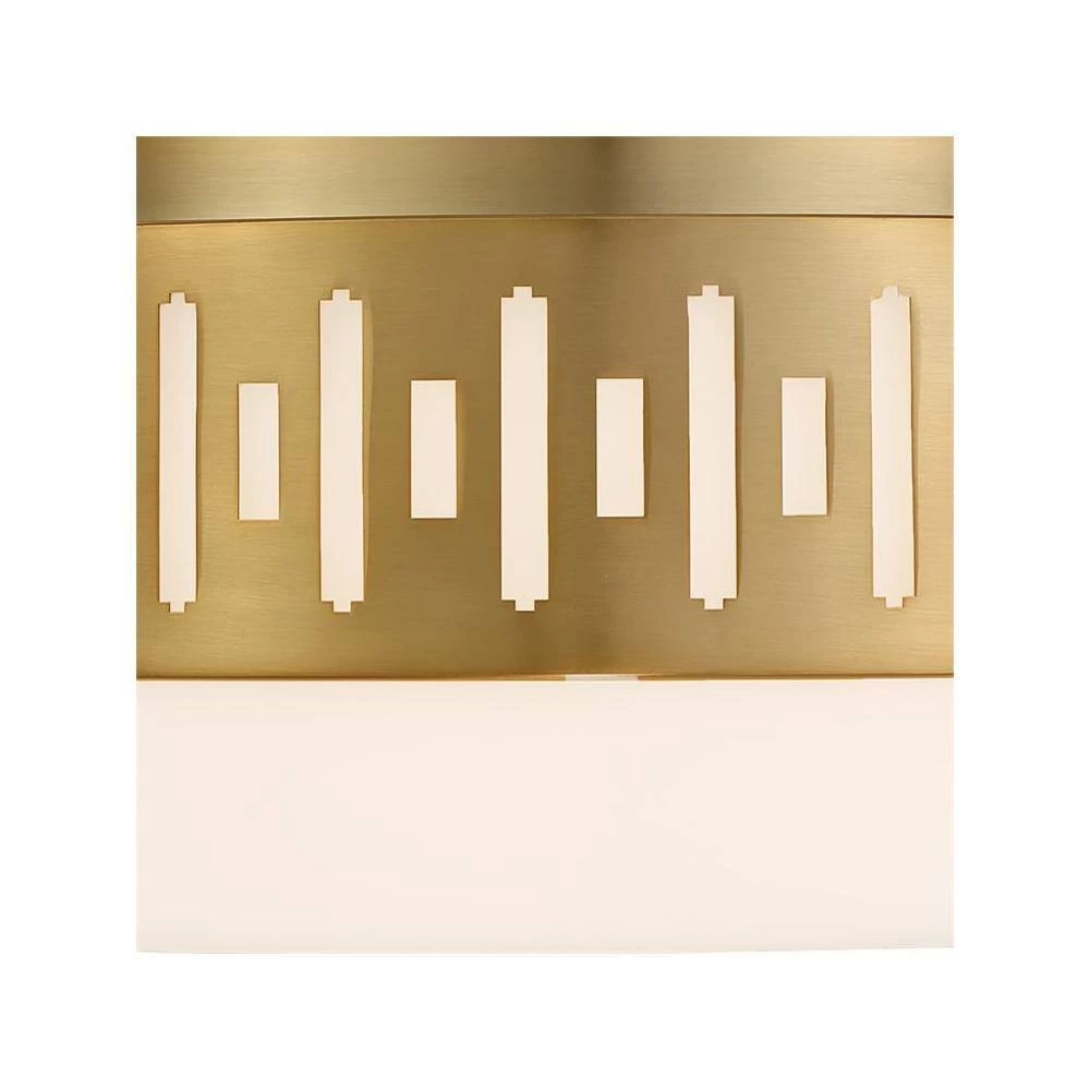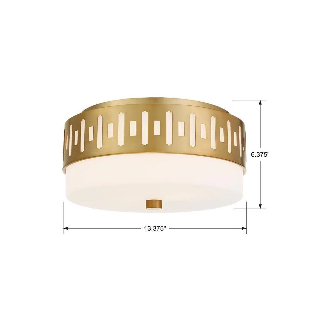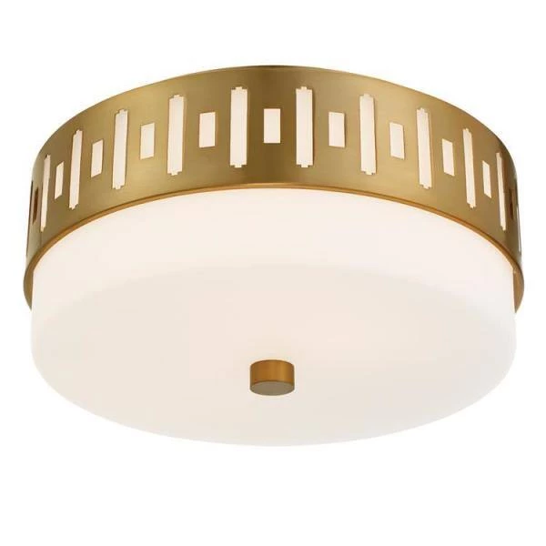 The white glass and geometric metal pattern of the Keaton ceiling mount is a functional and stylish addition to spaces that have low ceilings. The solid glass evenly diffuses the spread of-light throughout the room, casting a soft glow. Crystorama is known for its standout-lighting, which is exceptional in quality and design.