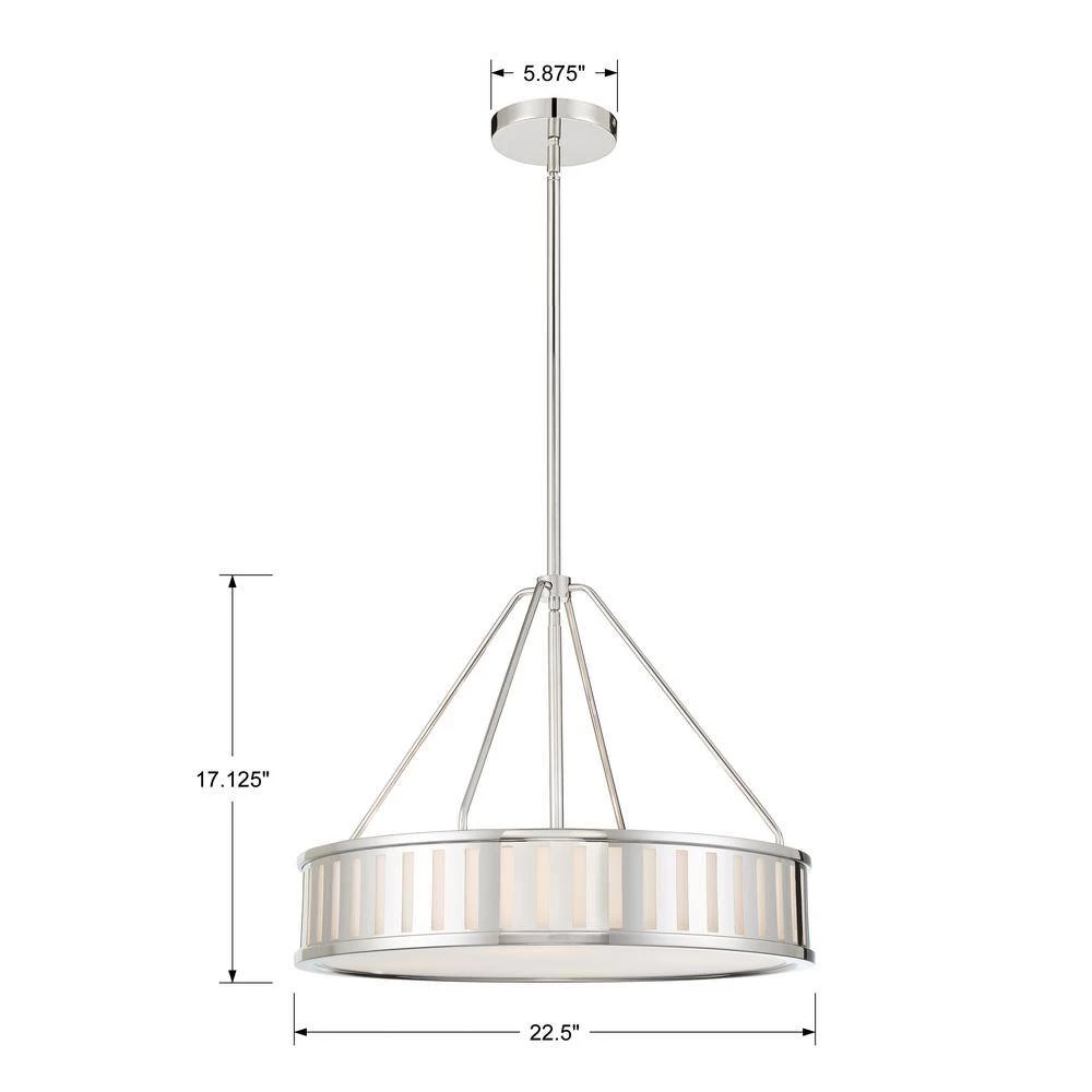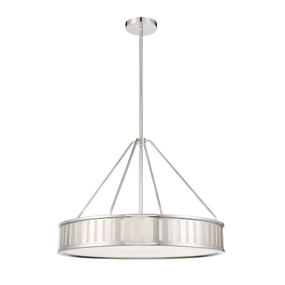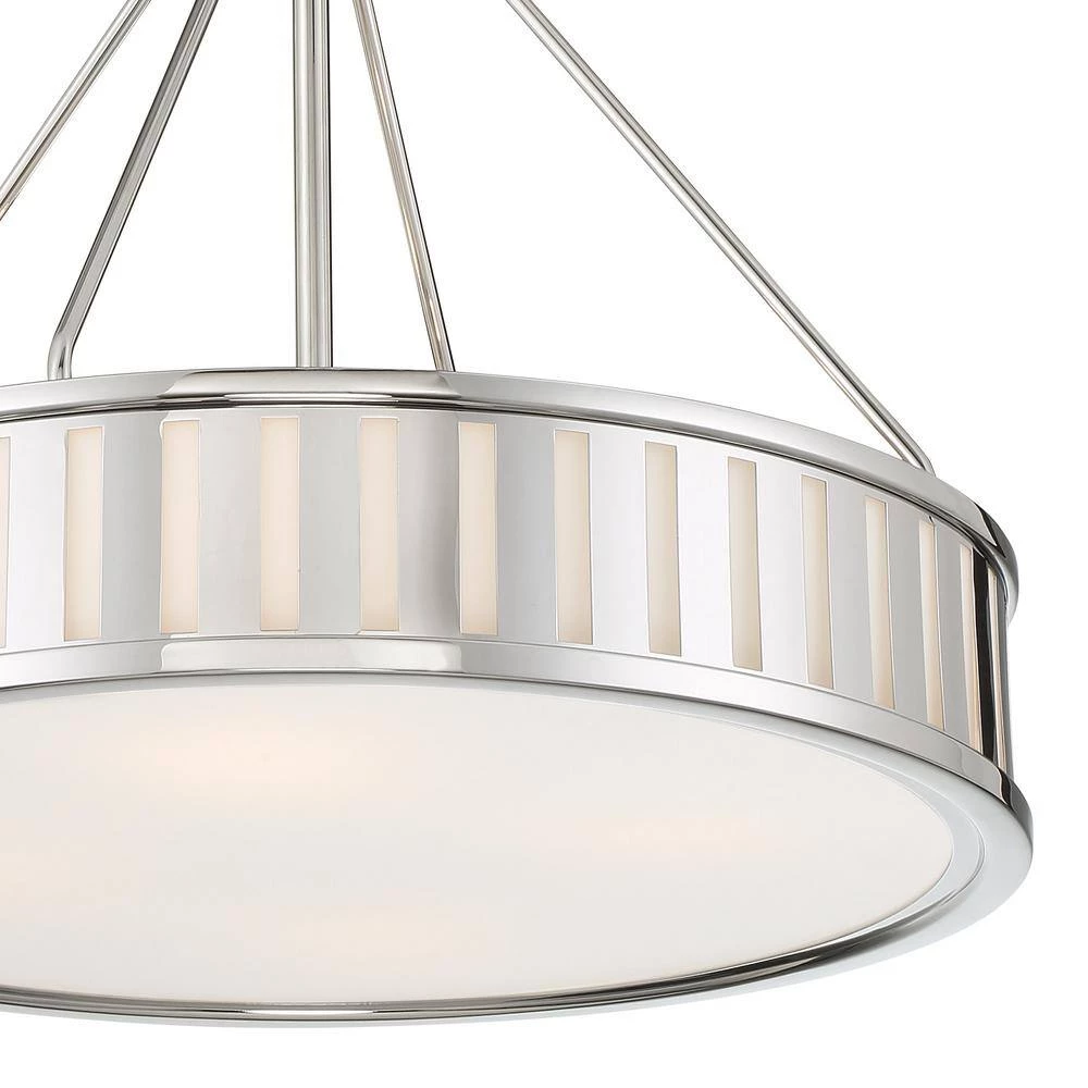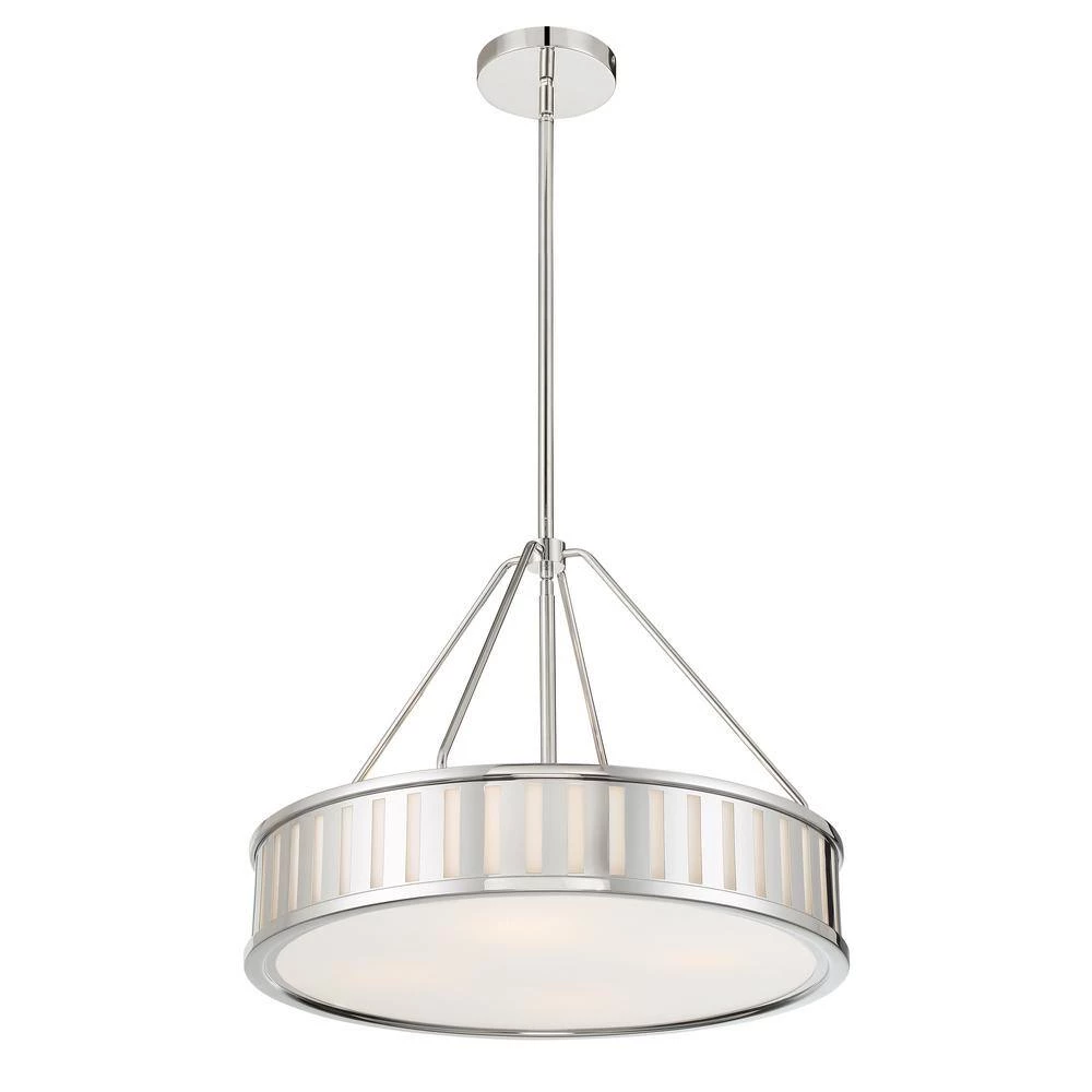 The contemporary Kendal collection makes a statement with its graphic uniform pattern. Its metal frame surrounds white glass in this elegant drum-shaped pendant. The high contrast of matte gold or polished nickel against white glass is a great way to add a touch of drama to a room. Crystorama is known for its standout lighting, which is exceptional in quality and design.