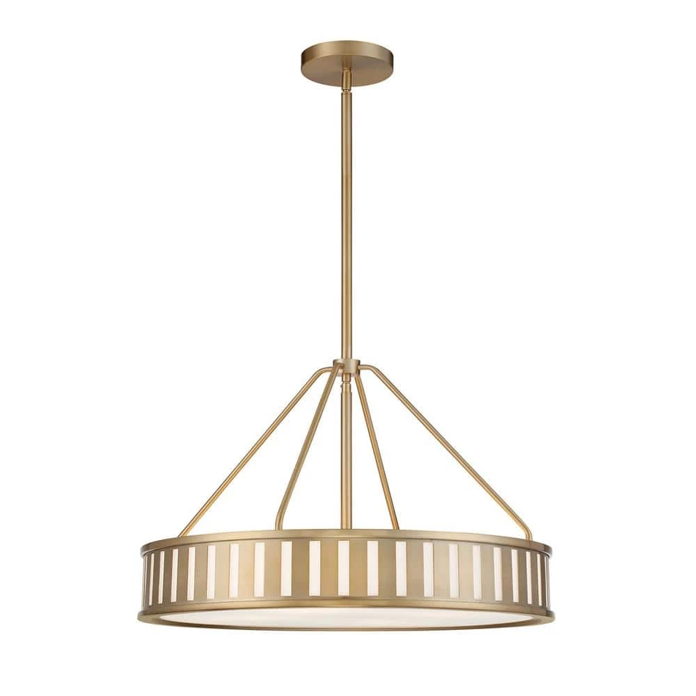The contemporary Kendal collection makes a statement with its graphic uniform pattern. Its metal frame surrounds white glass in this elegant drum-shaped pendant. The high contrast of matte gold or polished nickel against white glass is a great way to add a touch of drama to a room. Crystorama is known for its standout lighting, which is exceptional in quality and design.